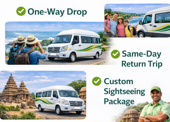 With Chennai Green Cabs, you can enjoy a stress-free and comfortable road trip with punctual pickup, well-maintained vehicles, and professional drivers who know the best routes and sightseeing spots. Whether you are planning a family outing, corporate trip, or group tour, our Tempo Traveller Rental in Chennai service is the perfect choice for spacious and budget-friendly travel. We offer AC tempo travellers, luxury vans, and customized travel packages to suit your needs. From doorstep pickup in areas like Tambaram, T. Nagar, and OMR to flexible return timings, Chennai Green Cabs ensures a safe, reliable, and memorable Chennai to Mahabalipuram journey for every traveler.