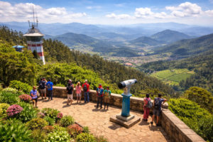 The surrounding forests and hills create a relaxing atmosphere for travelers and nature lovers.