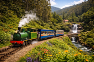The slow scenic journey allows travelers to enjoy the stunning beauty of the Nilgiri mountains.