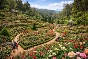 Visitors can walk through beautifully arranged terraces filled with different types of roses.